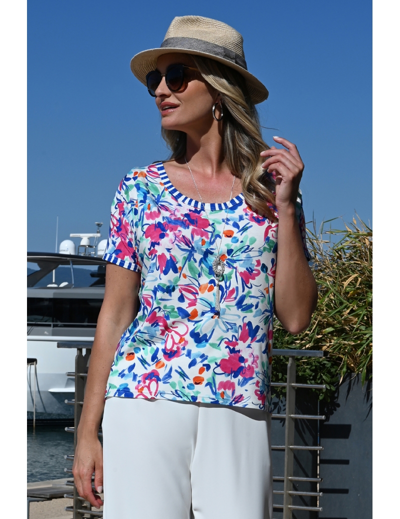 T-shirt été femme en jersey imprimé - Bordage manche et encolure, et dos en jersey à rayures bleues - Coupe confort - Encolure ronde - Emmanchures tombantes - Logo BA strass cristal au dos.