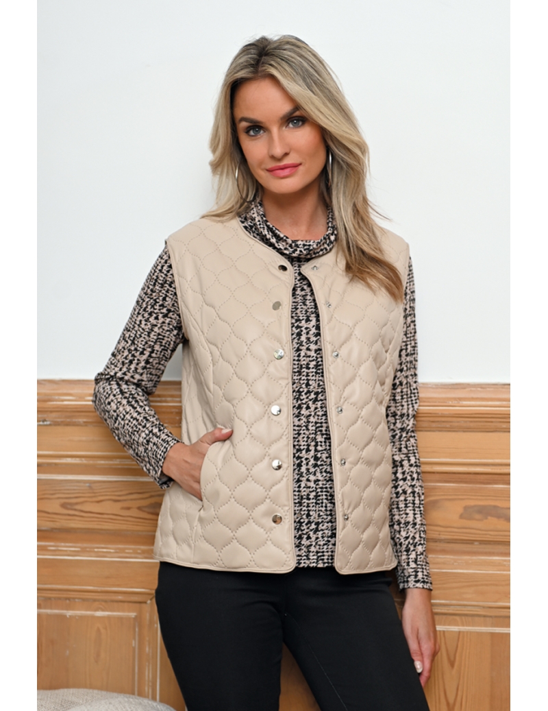 Gilet esprit doudoune sans manche en simili-cuir matelassé beige - Doublure en satin de polyester vanille - Coupe cintrée - Découpe princesse devant et dos - Encolure ronde - Fermeture par boutons pression argentés sur le milieu devant - Poches verticales zippées - Passepoil en simili-cuir ton sur ton tout autour du gilet.