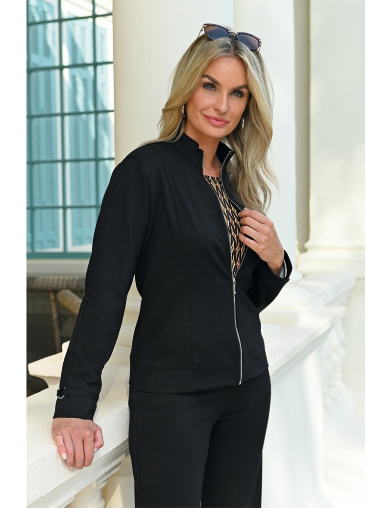 Gilet en milano noir - Petit col montant - Découpes verticales sur le devant - 2 pinces dos - Manches longues avec anneau argenté au poignet et fine bandelette en tissu ton sur ton sur le côté de la manche remontant jusqu'à l'encolure - Fermeture zip métal argenté.